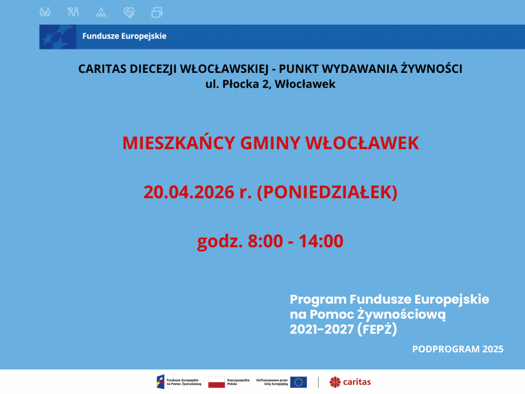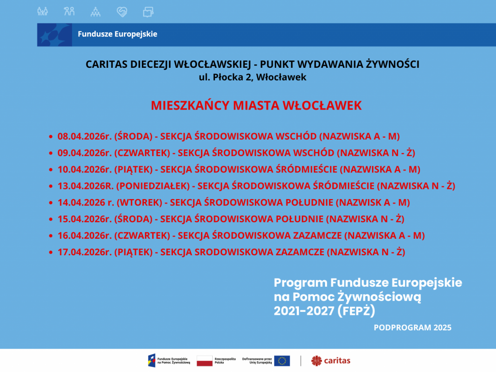 Uprzejmie prosimy o przestrzeganie wyznaczonych terminów odbioru, co pozwoli usprawnić organizację i przebieg wydawania żywności.